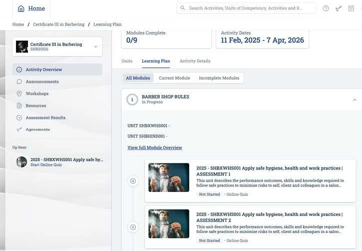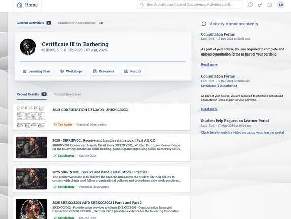 The Student Learner Portal will look like the below (NOTE: When the student first logins in, they have the option to watch a video to guide them through the system) There is an Axcelerate APP students can download. It is recommended they use GOOGLE CHROME.